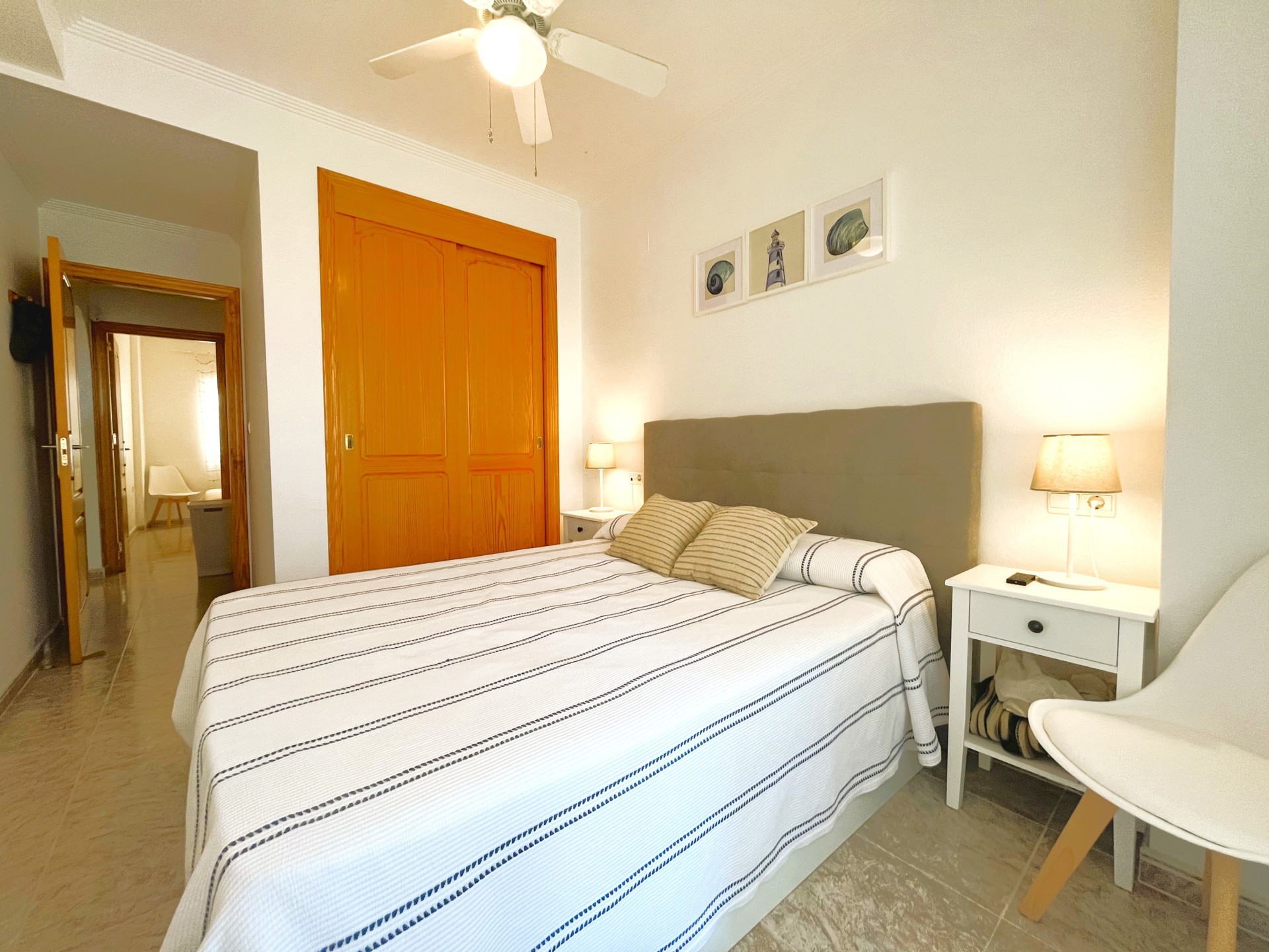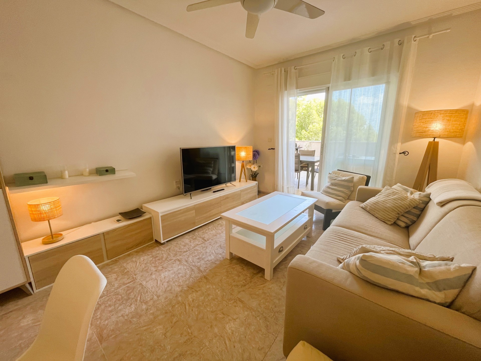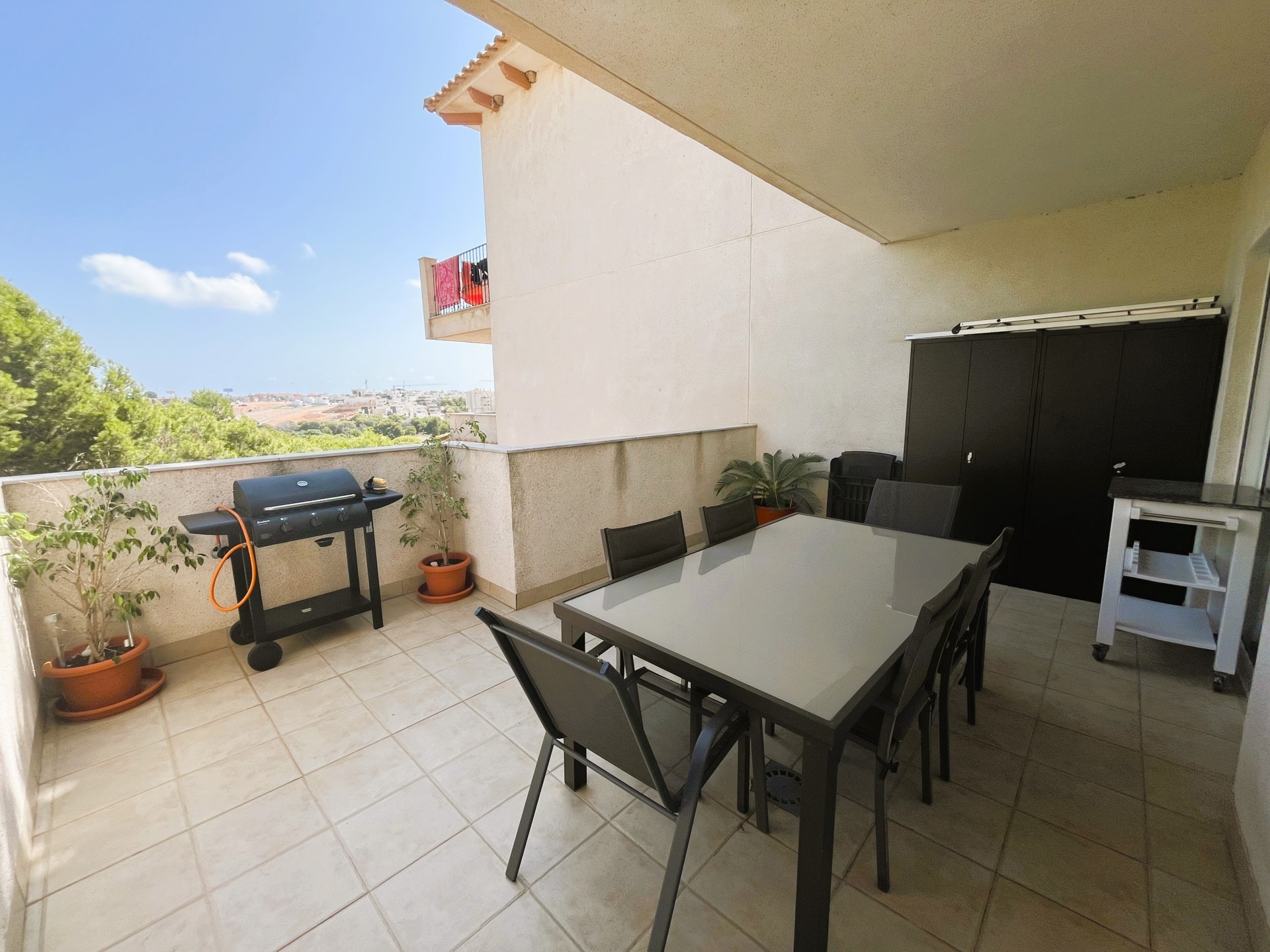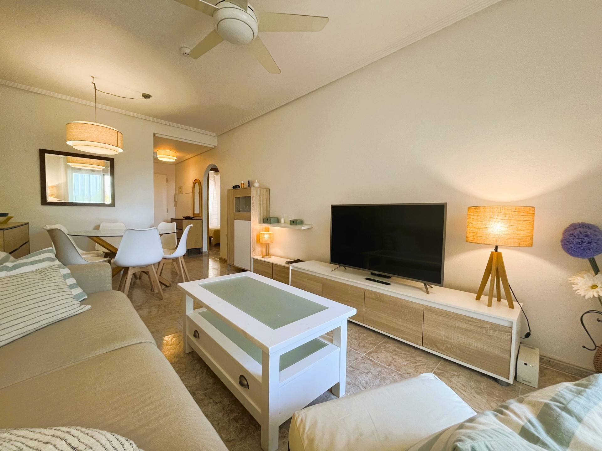 Estupendo piso de dos dormitorios en la zona de Campoamor con fantásticas vistas. La vivienda dispone de una amplia terraza ideal para disfrutar de una barbacoa con los amigos, un salón comedor de estilo moderno y muy luminoso, una cocina independiente bien equipada y con lavavajillas. Las habitaciones son muy luminosas, tienen ventilador de techo, armarios empotrados y comparten un baño. La vivienda dispone además de un amplio patio de entrada que se puede utilizar como zona de parking, tiene piscina comunitaria y un área de juego infantil. Se encuentra cerca de todos los servicios, restaurantes, bares, supermercado y las mejores playas de la zona. Este apartamento no se puede reservar por menos de 11 noches. Es una estancia mid term conforme al Decreto Ley 9/2024 del gobierno de la Comunidad Valenciana..
