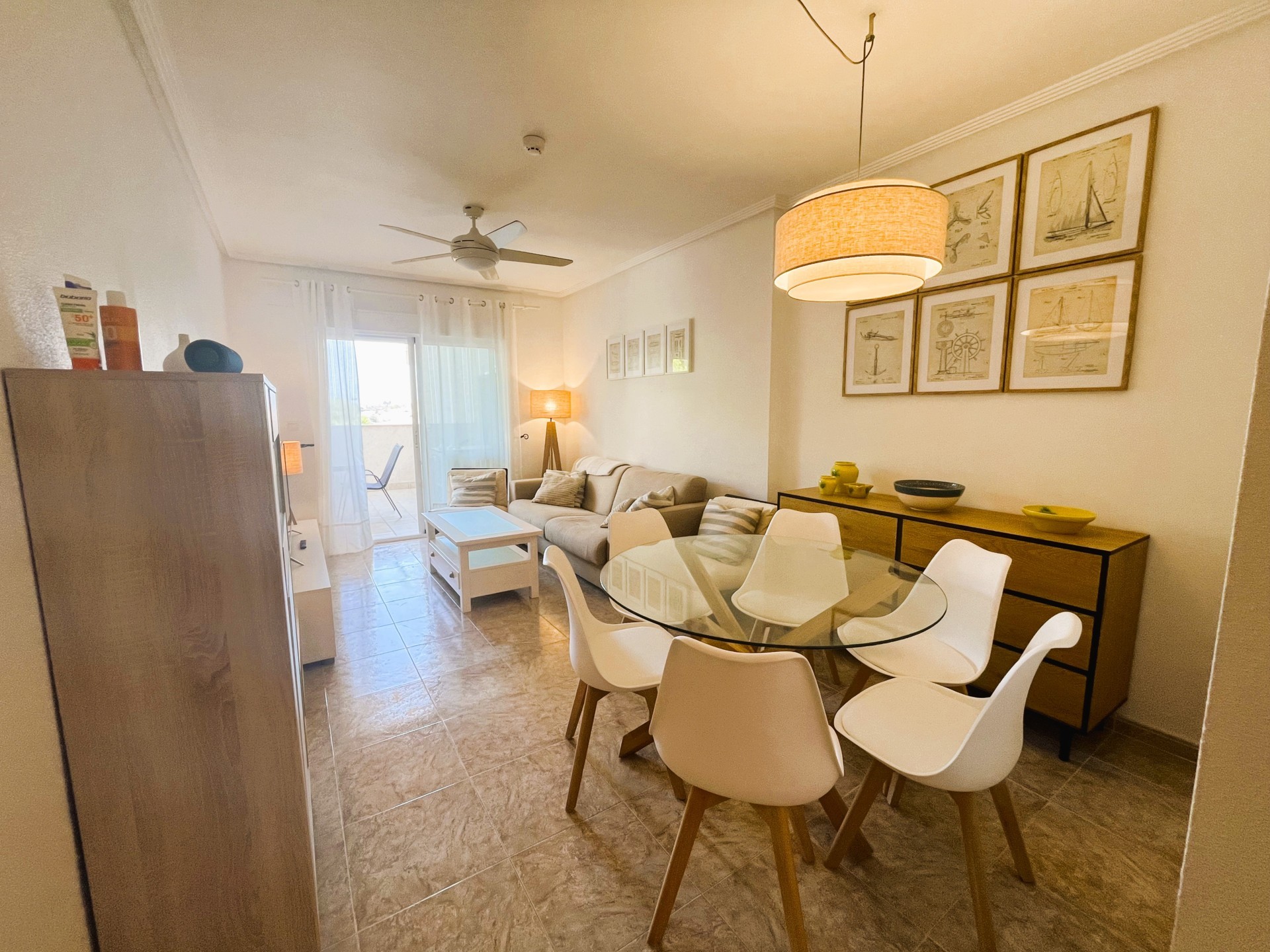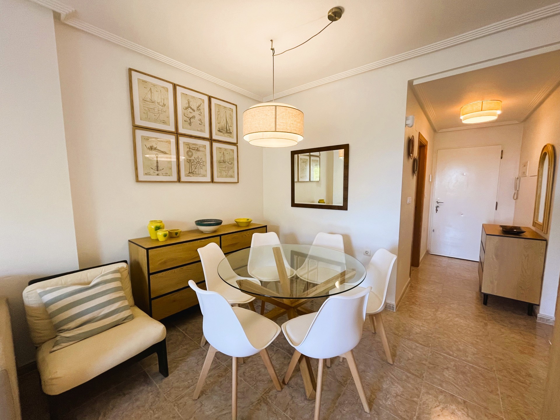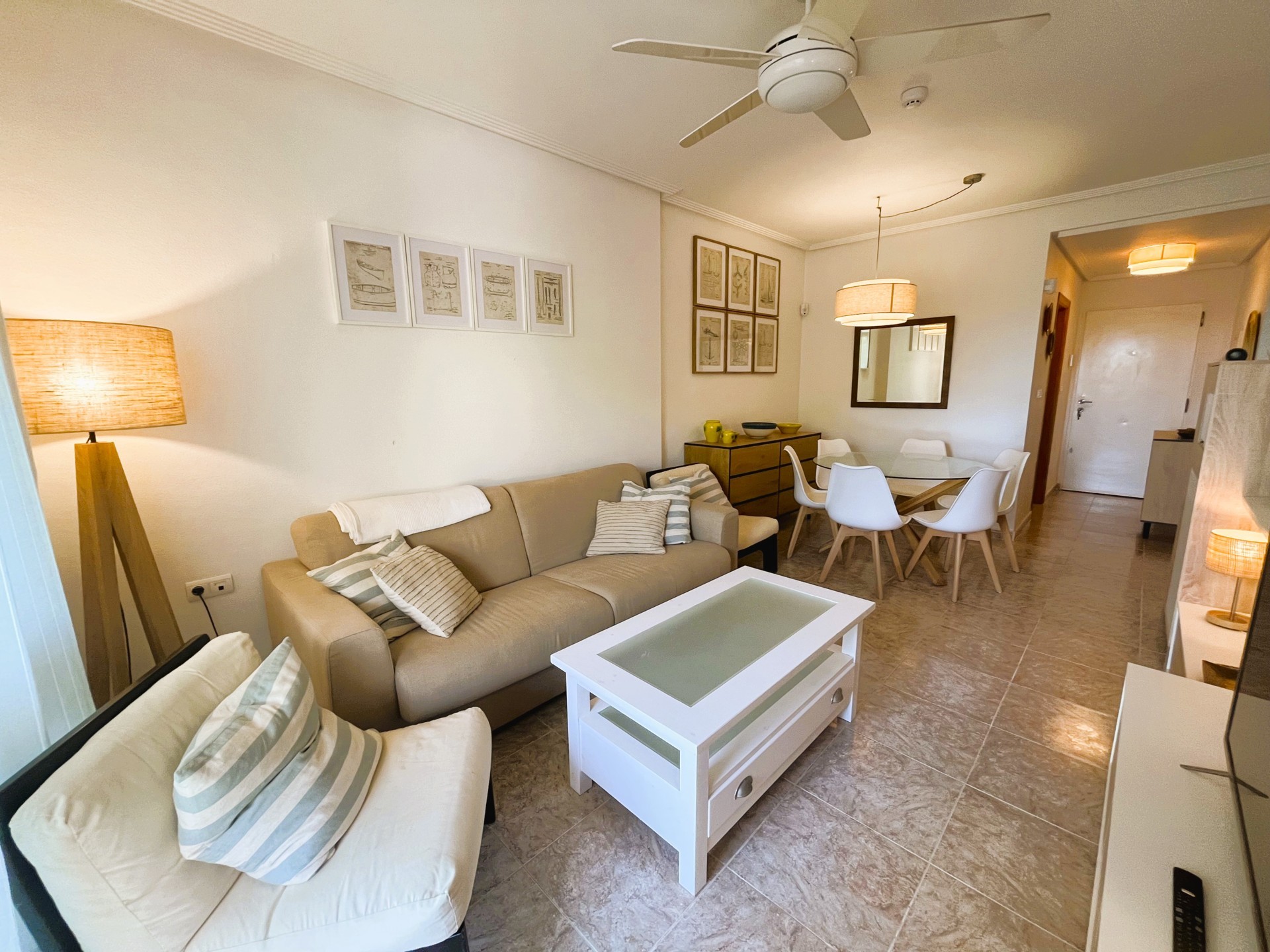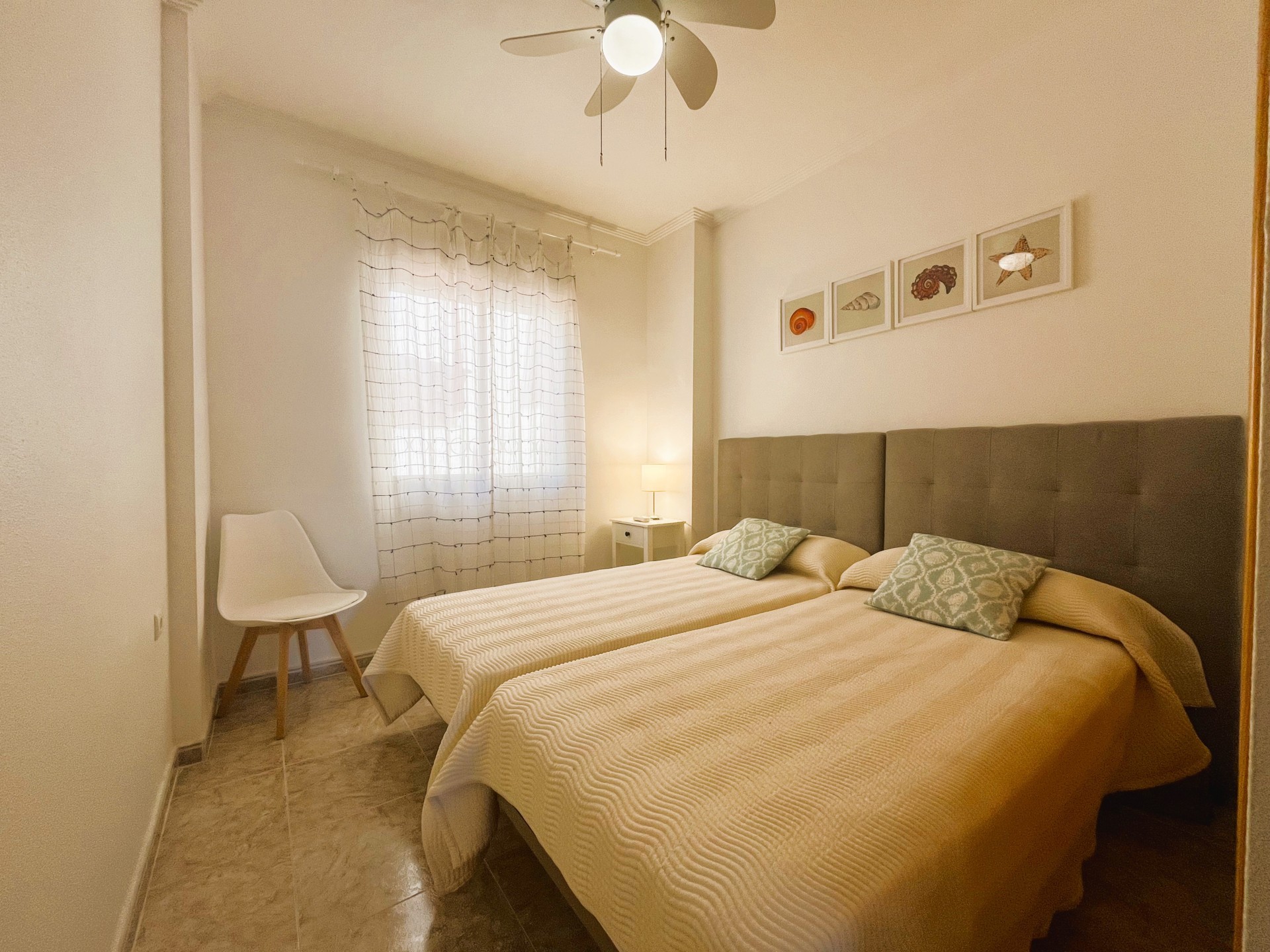 Estupendo piso de dos dormitorios en la zona de Campoamor con fantásticas vistas. La vivienda dispone de una amplia terraza ideal para disfrutar de una barbacoa con los amigos, un salón comedor de estilo moderno y muy luminoso, una cocina independiente bien equipada y con lavavajillas. Las habitaciones son muy luminosas, tienen ventilador de techo, armarios empotrados y comparten un baño. La vivienda dispone además de un amplio patio de entrada que se puede utilizar como zona de parking, tiene piscina comunitaria y un área de juego infantil. Se encuentra cerca de todos los servicios, restaurantes, bares, supermercado y las mejores playas de la zona. Este apartamento no se puede reservar por menos de 11 noches. Es una estancia mid term conforme al Decreto Ley 9/2024 del gobierno de la Comunidad Valenciana..