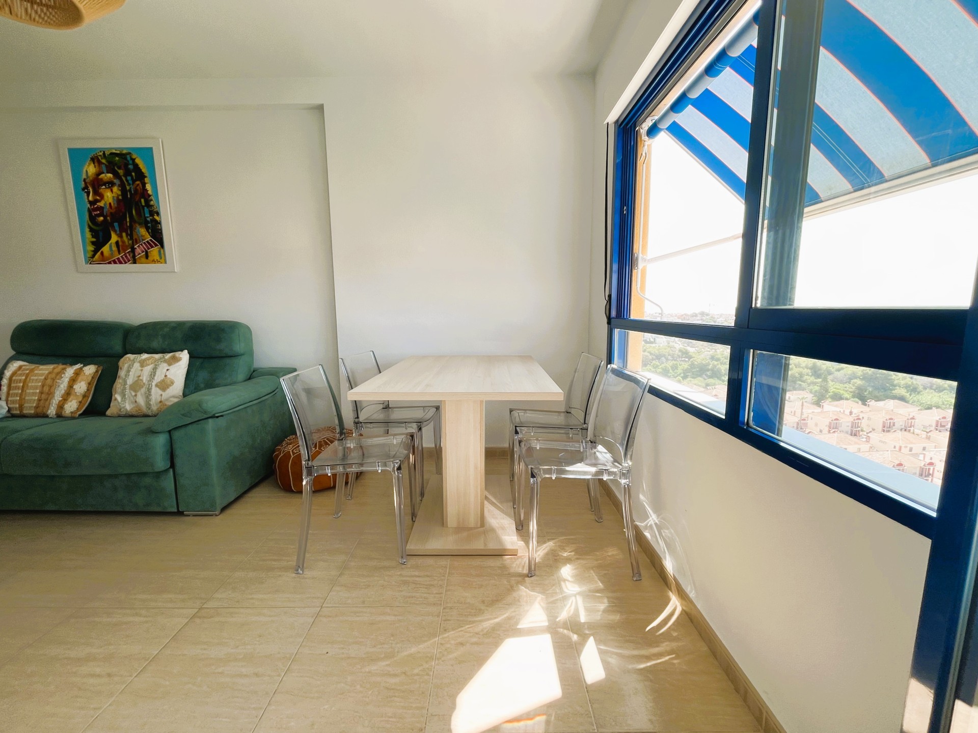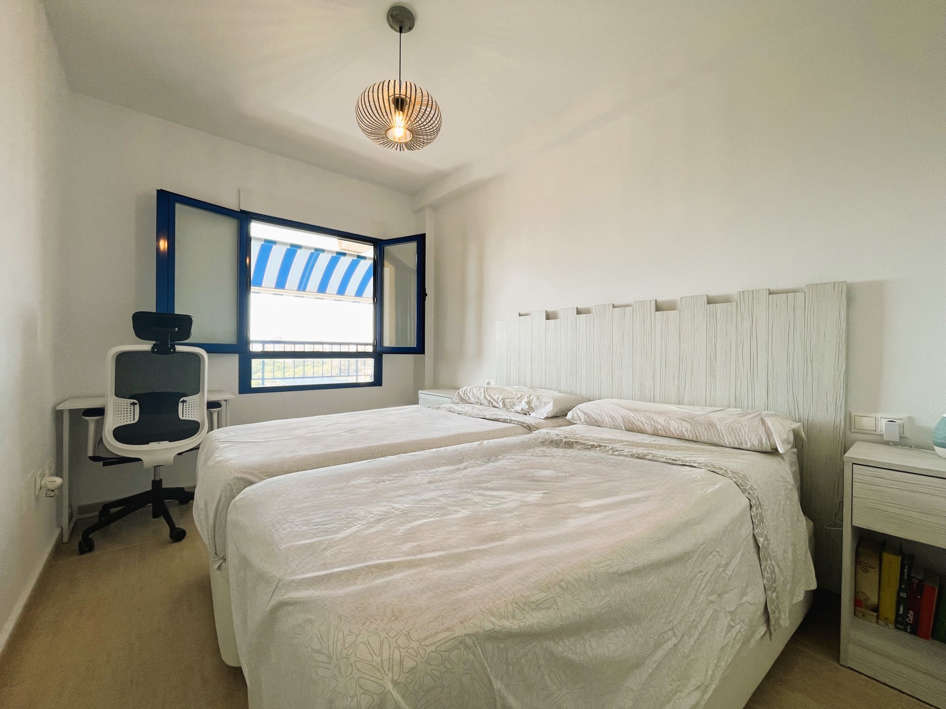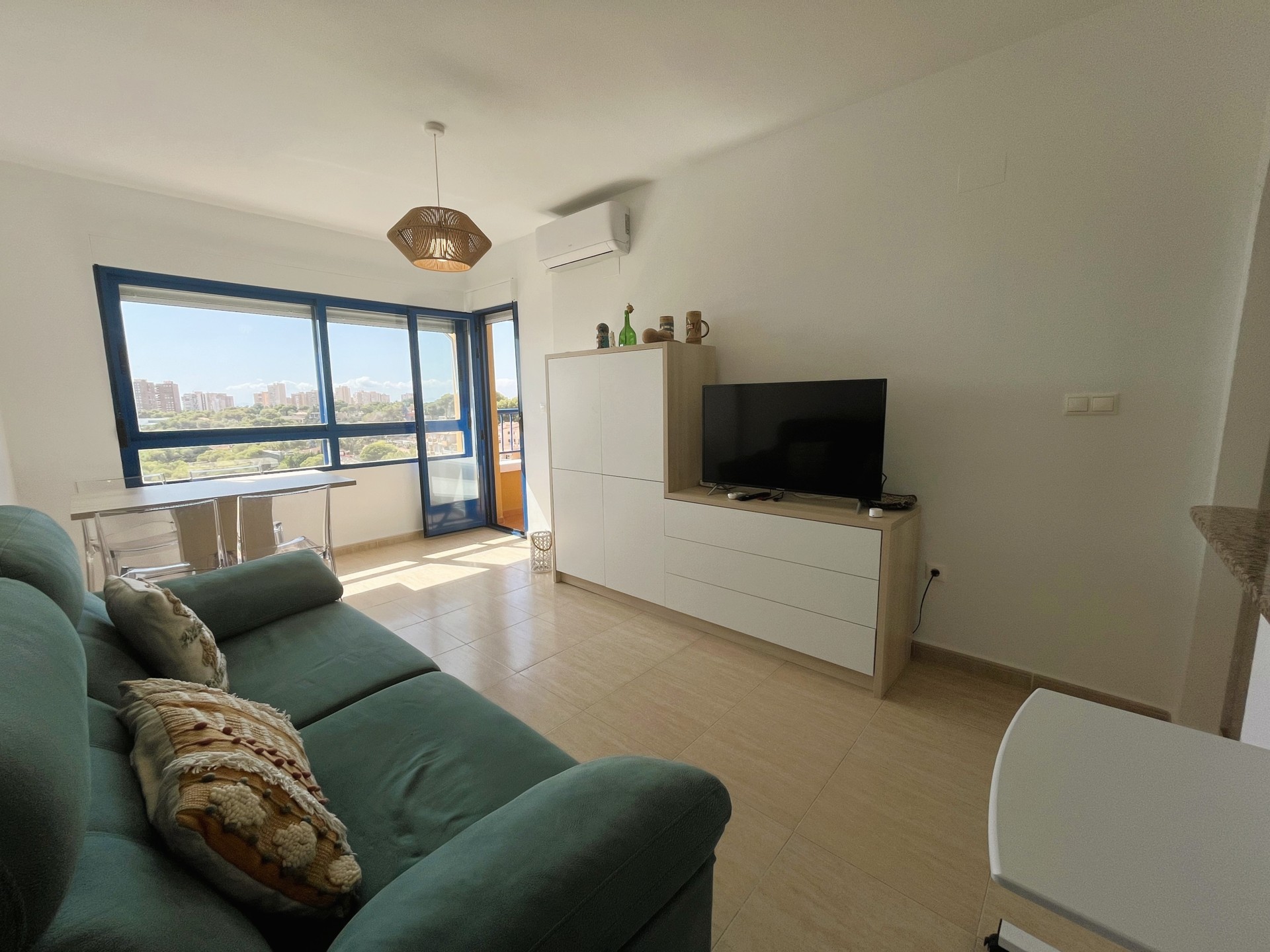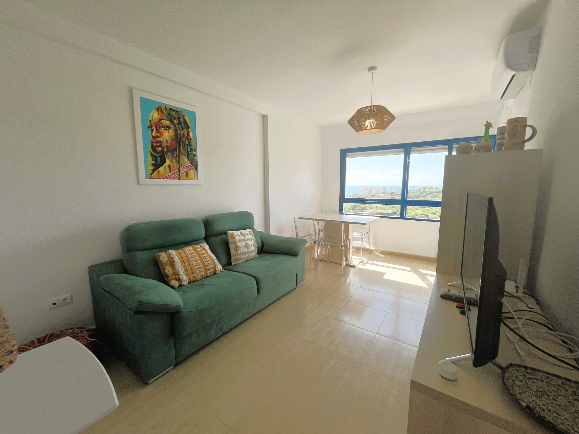 Estupendo apartamento de un dormitorio con fantásticas vistas al mar. La vivienda tiene una acogedora terraza, ideal para disfrutar de un buen desayuno. El salón comedor es muy luminoso y cuenta con un cómodo sofá cama y aire acondicionado. La cocina es independiente, de estilo moderno, y tiene una práctica ventana. El dormitorio principal dispone de un amplio armario empotrado y el baño cuenta con ducha. También dispone de plaza de aparcamiento. El residencial cuenta con una de las piscinas más bonitas de la zona y una pista de tenis. Se encuentra cerca de todos los servicios: bares, restaurantes, supermercado y las mejores playas de la zona. Este apartamento no se puede reservar por menos de 11 noches. Es una estancia mid term conforme al Decreto Ley 9/2024 del gobierno de la Comunidad Valenciana..