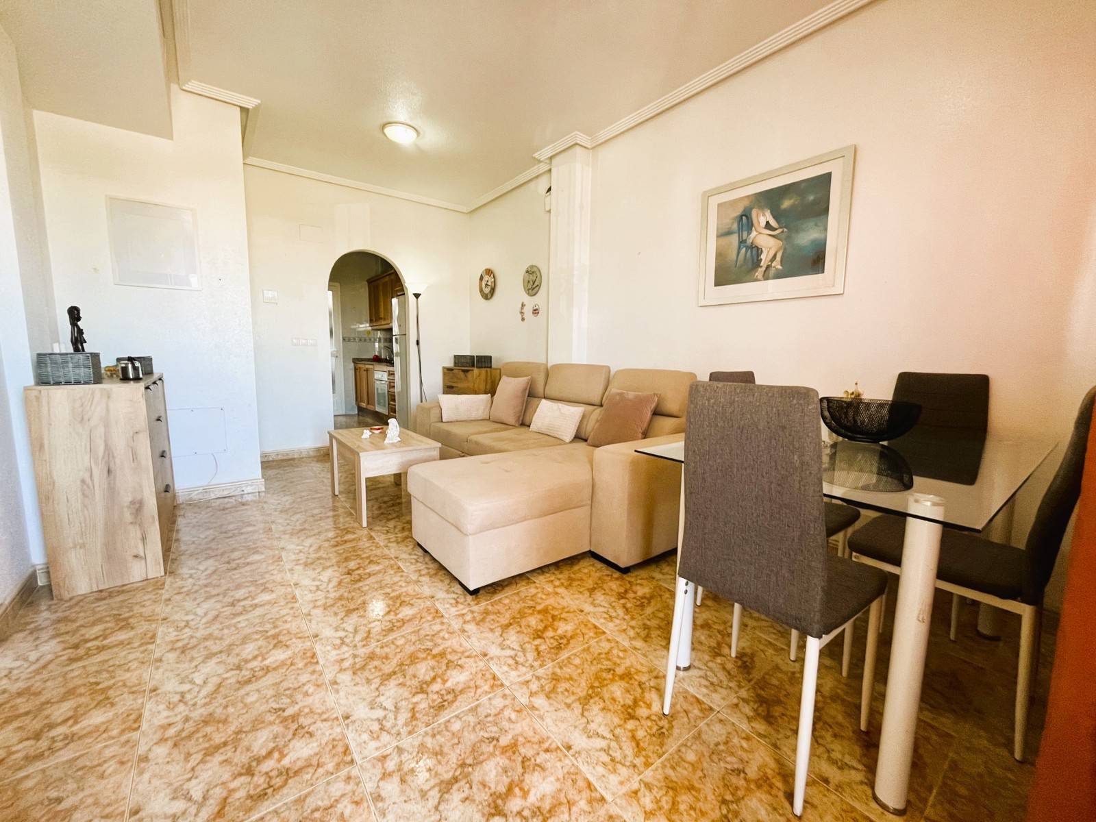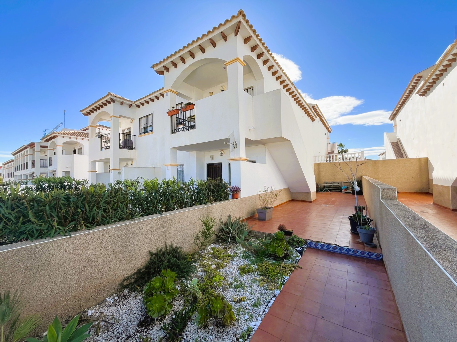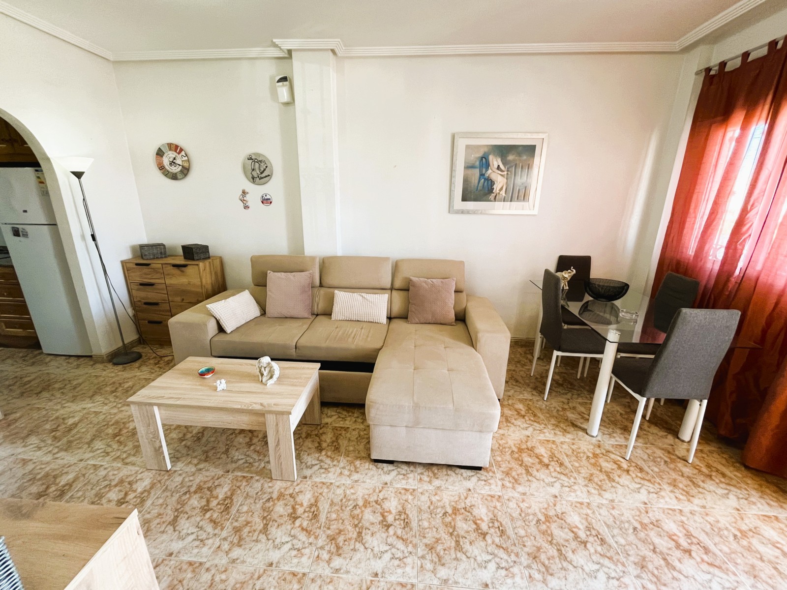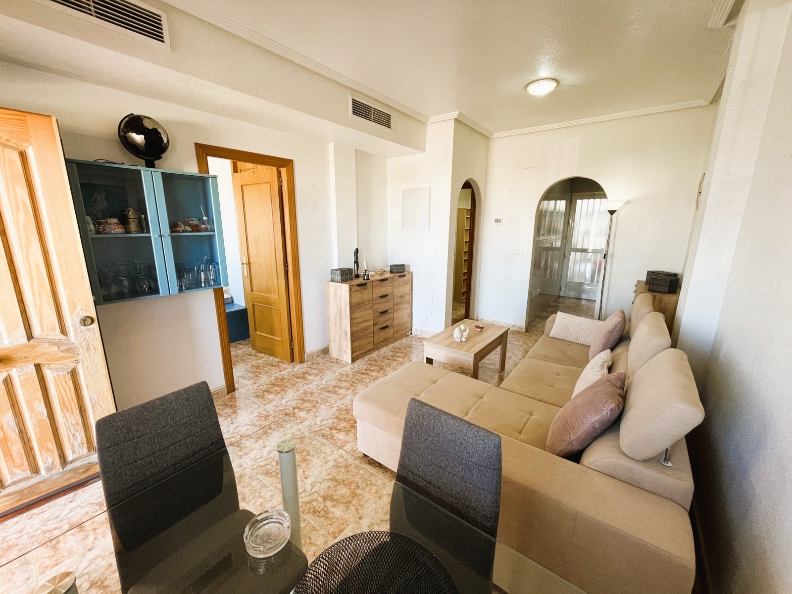 Fantástica vivienda de dos dormitorios en La Zenia muy cerca de todos los servicios y en un residencial muy tranquilo. El apartamento tiene un amplio patio de entrada, una terraza muy agradable y el salón comedor es muy luminoso. Dispone de una cocina independiente con acceso a una zona de lavadero, dos dormitorios con armarios empotrados y dos baños. Consta de aire acondicionado por conducto y en la parte de arriba tiene un maravilloso solárium con vistas al mar, ideal para tomar un aperitivo con los amigos. Tiene plaza de aparcamiento. Ademas el residencial dispone de dos piscinas comunitarias y zonas verdes. Este apartamento no se puede reservar por menos de 11 noches. Es una estancia mid term conforme al Decreto Ley 9/2024 del gobierno de la Comunidad Valenciana..