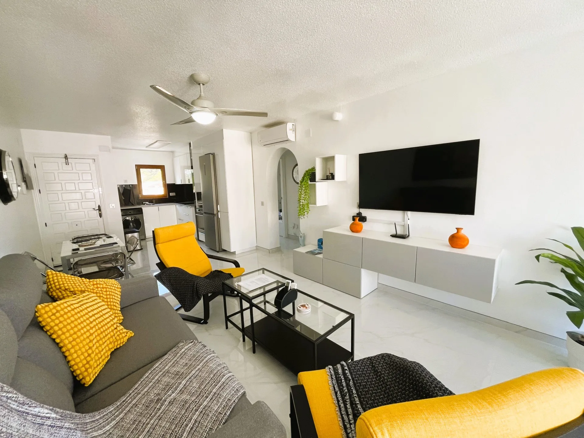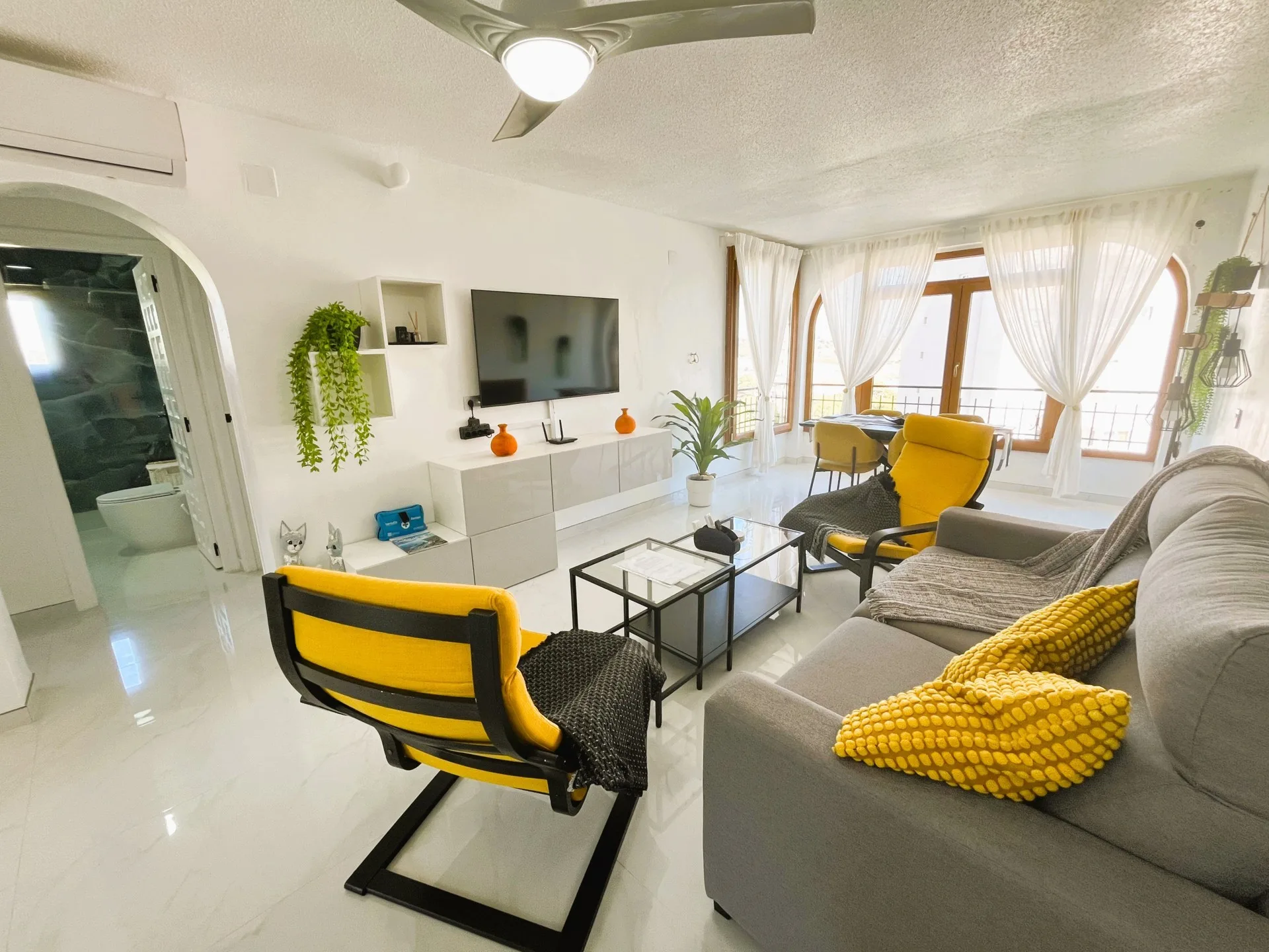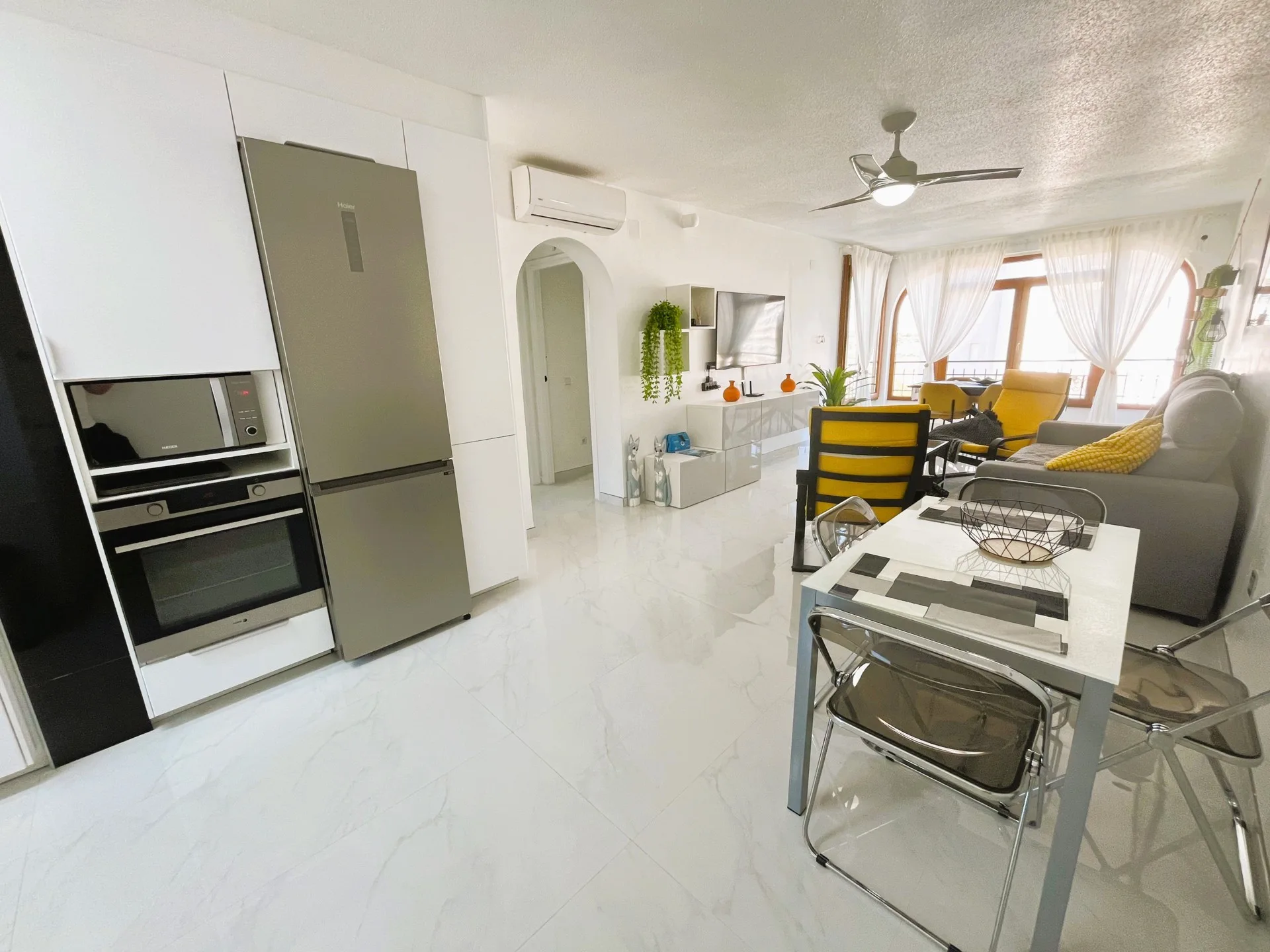 Estupendo piso completamente reformado en la zona alta de Campoamor. Esta luminosa y acogedora vivienda ha sido recientemente reformada. Dispone de un amplio salón-comedor decorado con mobiliario de estilo moderno, que se conecta con una encantadora terraza acristalada, ideal como zona de comedor desde la que se puede disfrutar de unas preciosas vistas. La cocina americana está perfectamente integrada en el espacio, totalmente equipada y cuenta con una práctica ventana que aporta abundante luz natural, creando un ambiente agradable y funcional. El dormitorio principal incluye una cómoda cama de matrimonio, ventilador de techo, un armario espacioso y acceso directo a una bonita terraza, perfecta para disfrutar de un café por la mañana o relajarse leyendo al aire libre. El segundo dormitorio está equipado con una práctica litera y armario empotrado, ideal para familias o como espacio adicional. Tiene un baño completo con ducha. La vivienda se ubica en una urbanización cerrada que ofrece tranquilidad y acceso a una estupenda piscina comunitaria. Cerca a todos los servicios, restaurantes, paseo marítimo, parques infantiles, y unas playas espectaculares en Campoamor. Este apartamento no se puede reservar por menos de 11 noches. Es una estancia “mid term” conforme al Decreto Ley 9/2024 del gobierno de la Comunidad Valenciana..