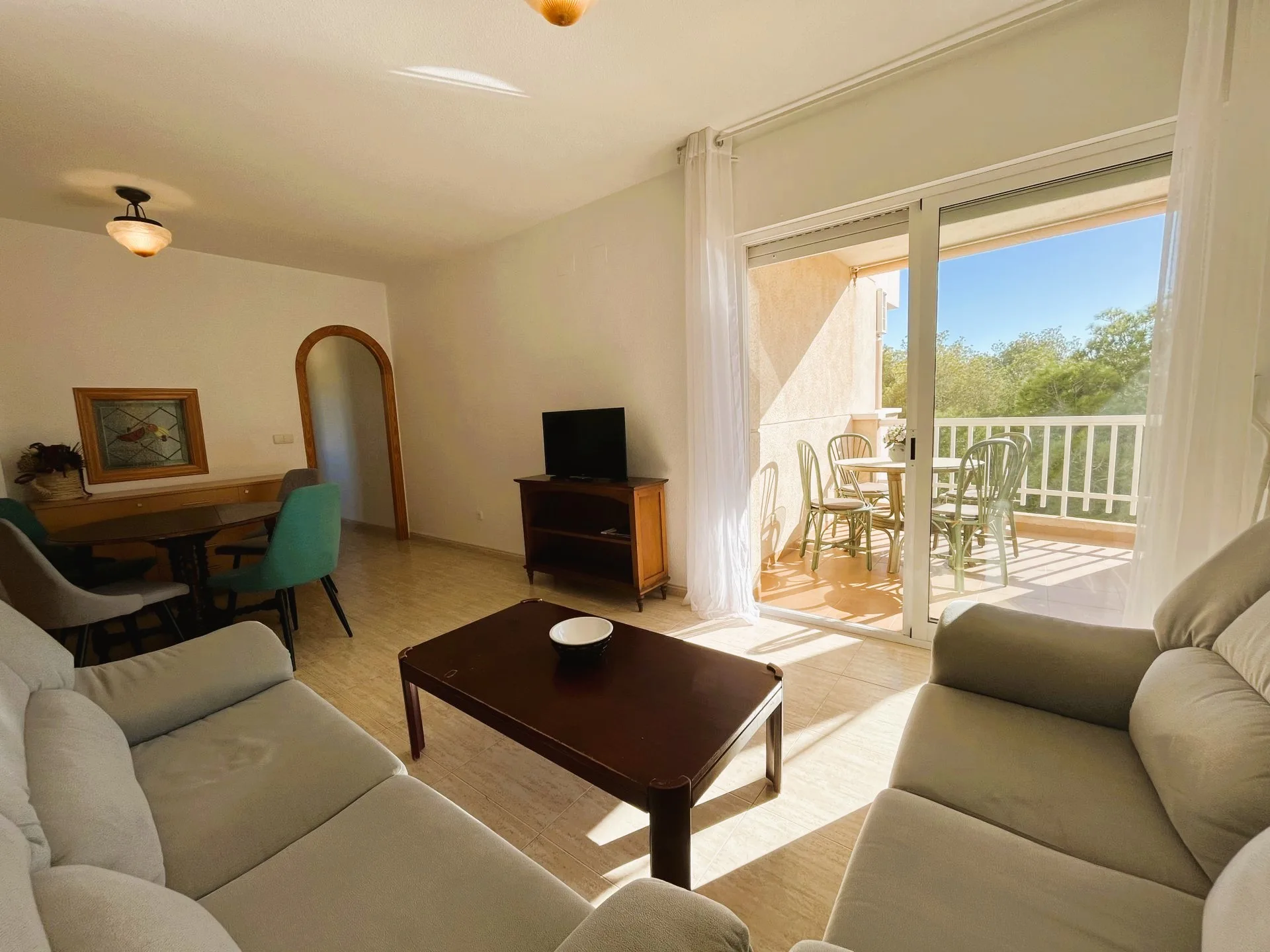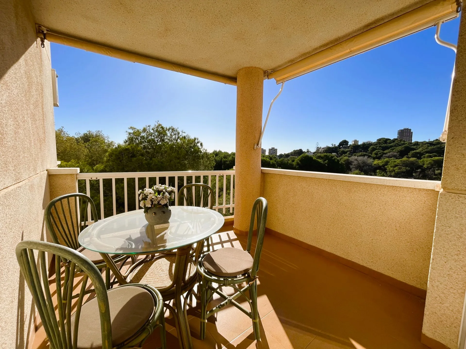 Estupendo apartamento con vistas a la pinada de Campoamor a tan solo 450 metros de la playa. La vivienda tiene un salón comedor muy amplio y luminoso con acceso directo a la terraza. La cocina es independiente y dispone de zona de lavadero. Tiene dos dormitorios y un baño. Consta de plaza de aparcamiento, acceso a piscina comunitaria, zona verde con pista de tenis y pádel. Se encuentra cerca de todos los servicios, restaurantes, bares, supermercado y las mejores calas de la zona. Este apartamento no se puede reservar por menos de 11 noches. Es una estancia mid term conforme al Decreto Ley 9/2024 del gobierno de la Comunidad Valenciana..