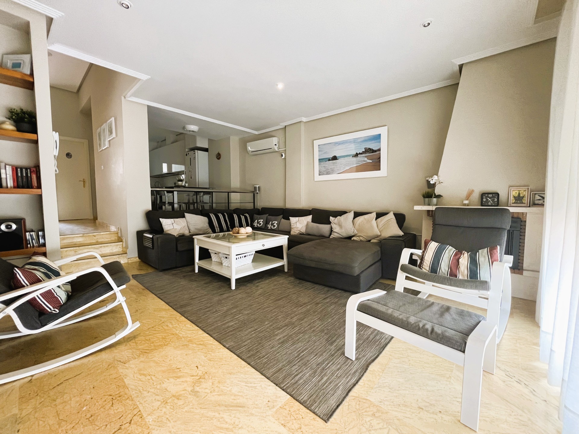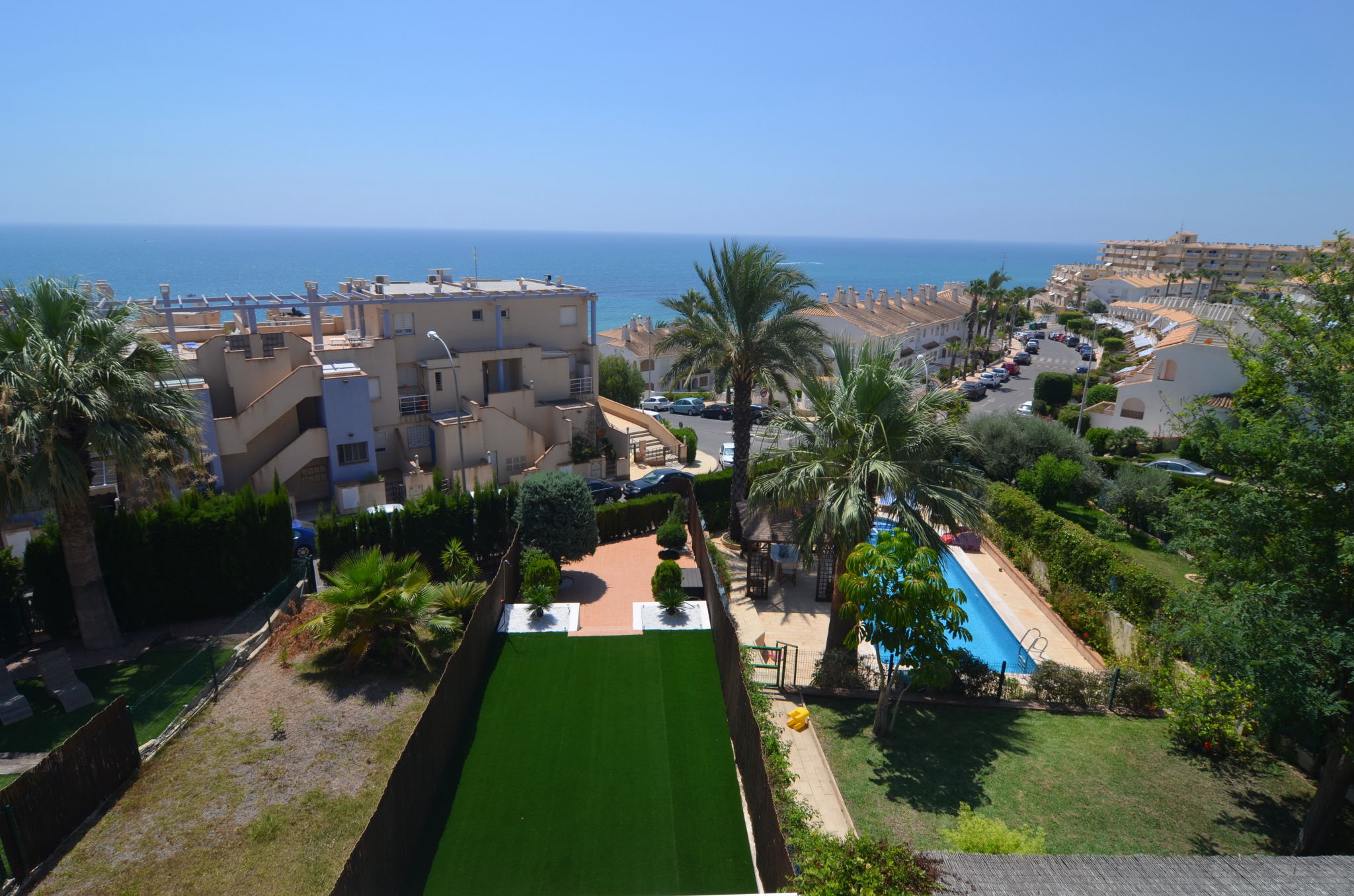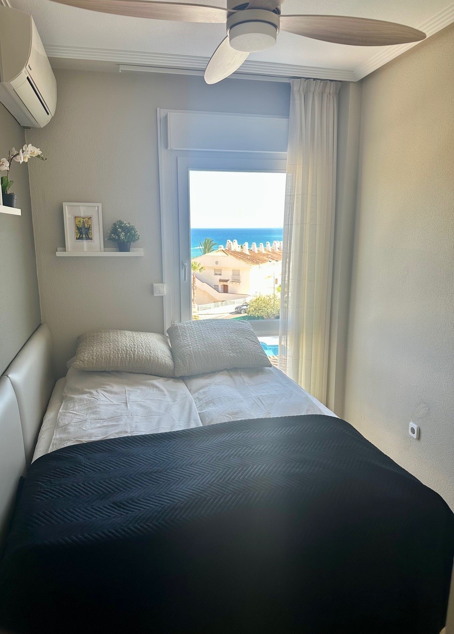 Stupendous Dúplex in Dehesa de Campoamor, Aguamarina with views of the Mediterranean Sea, only 160m from the beach, with an amazing and large garden with artificial grass and a porch that has beautiful Sea views, where you can enjoy a nice dinner out in the fresh air. The property has a welcoming and modern salon with a chimenea, next to an opened american kitchen and a storage area. The bedrooms are found on the second floor, a total of 3 bedrooms and 3 bathrooms. On the third floor there is a big solarium, with spectacular views of the entire Coast, perfect place for star glazing at night. The home is located in a closed gated residencial with a common swimming pool and area to relax. It is close to all services, restaurants, bars, supermarkets, medical centres, markets, beach bars, Sea ports, maritime walks and close to some of the best coastal areas and beaches of the entire Costa Blanca. This apartment cannot be booked for less than 11 nights. It is a mid-term stay in accordance with Decree Law 9/2024 of the government of the Comunidad Valenciana..
