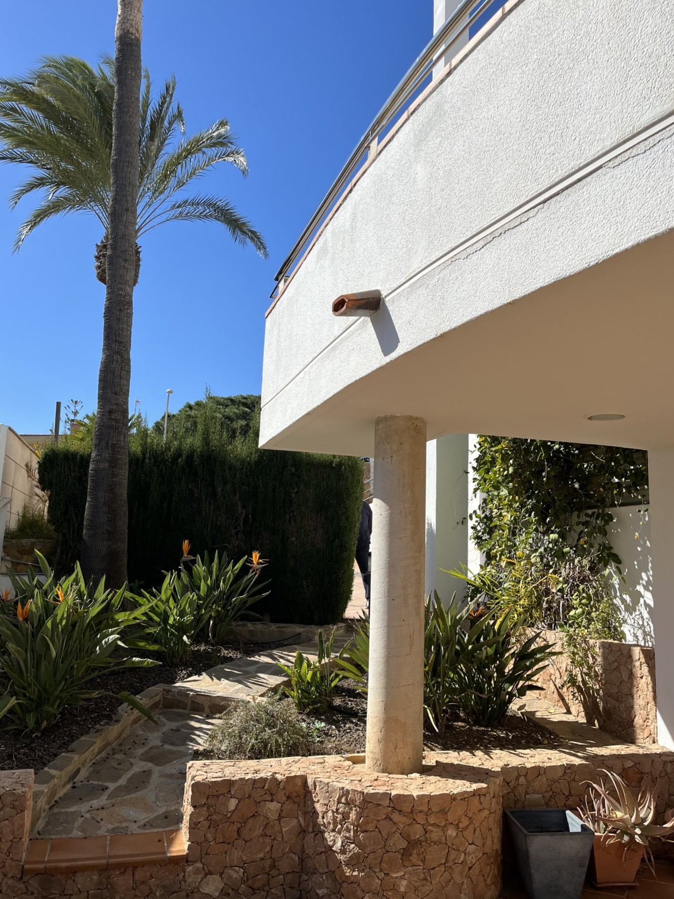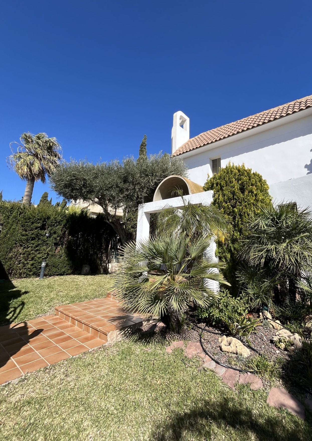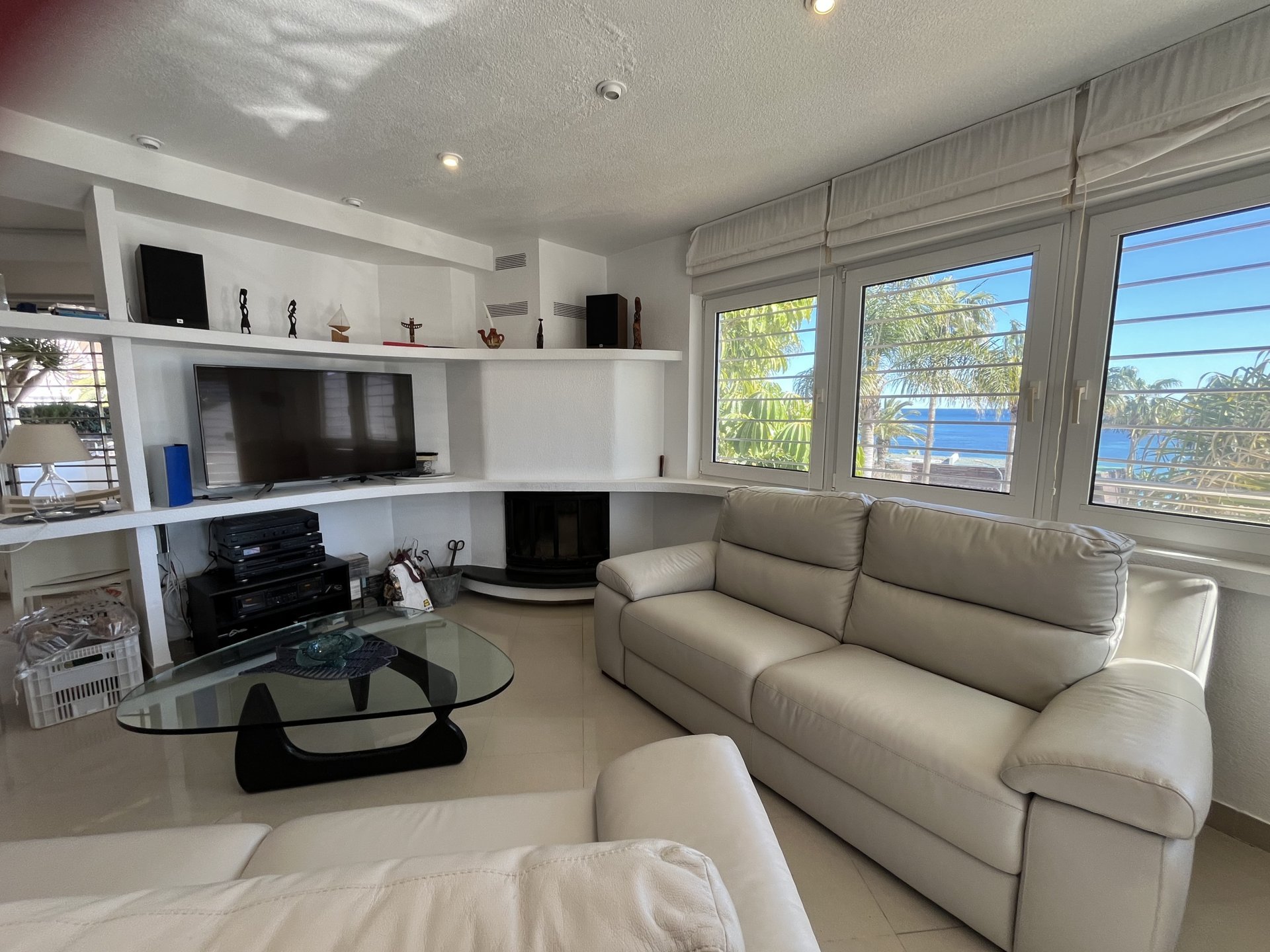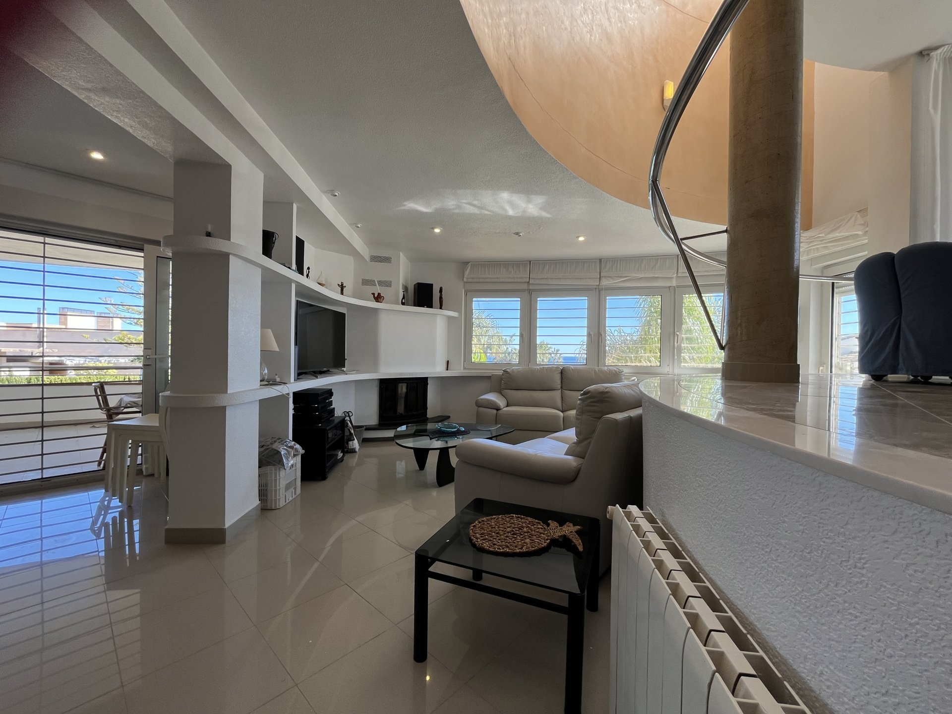 In a privileged spot overlooking to the sea, we find this villa with a unique design, created by architect Vicente Garaulet to resemble a ship’s sail. A spectacular design that can be appreciated in every corner of the house. This home is filled with light. It’s a dream come true. From its exterior, overflowing with vegetation, to its magical interior, where the interplay of heights, the influx of light, and the sea views leave you spellbound. We enter to the house into an entrance hall wherea ll the posible ways lead you to the kitchen, the living area, and the staircase to the bedrooms. It’s astonishing how comfort and convenience lie beneath the design, everything perfectly connected, making the most of the ideal space. The house’s location means that each room has a window with a view of either the blue of the sea or the green of the palm trees and surrounding vegetation. A perfect combination to feel relaxed wherever you look..
