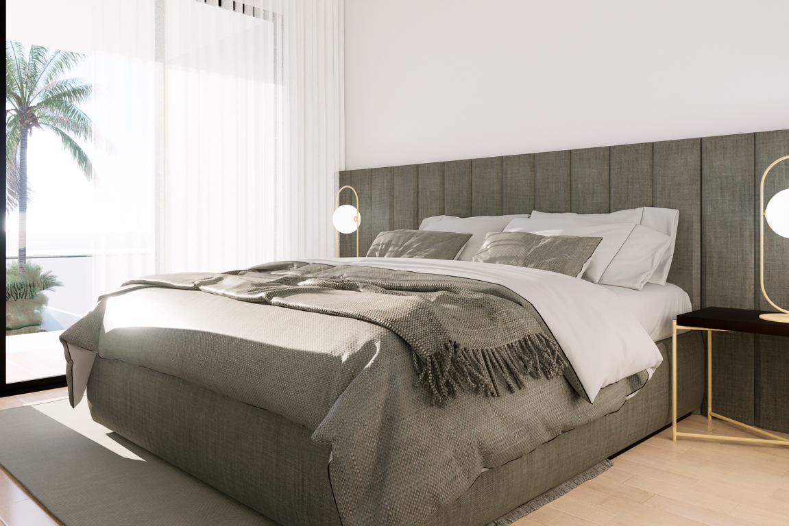 This exclusive residential property in La Zenia stands out for its contemporary architectural design, clean lines, and integrated spaces distributed across a total built area of 176 square meters. The home is functionally organized across three distinct levels: a ground floor of 60.80 square meters dedicated to living areas, a first floor of identical dimensions for the sleeping quarters, and a 54.40-square-meter solarium designed for outdoor enjoyment. The exterior features a private swimming pool, spacious paved terrace areas, and landscaped zones with palm trees that reinforce its sophisticated Mediterranean character. Inside, the home embraces an elegant minimalist style dominated by neutral tones, integrated lighting, and high-quality materials. The main living room is presented as an airy, sunlit space that connects directly to the outdoors through large floor-to-ceiling windows, complemented by wooden slat wall details that add warmth to the design. The bedrooms follow this aesthetic line, offering relaxing environments with modern furniture and sleek, functional built-in wardrobes. For their part, the bathrooms feature a luxury finish with marble-effect ceramic tiling, matte black recessed fixtures, and state-of-the-art wall-hung toilets. Each unit also includes its own private parking area within the plot, guaranteeing comfort and security in a modern, peaceful residential environment..