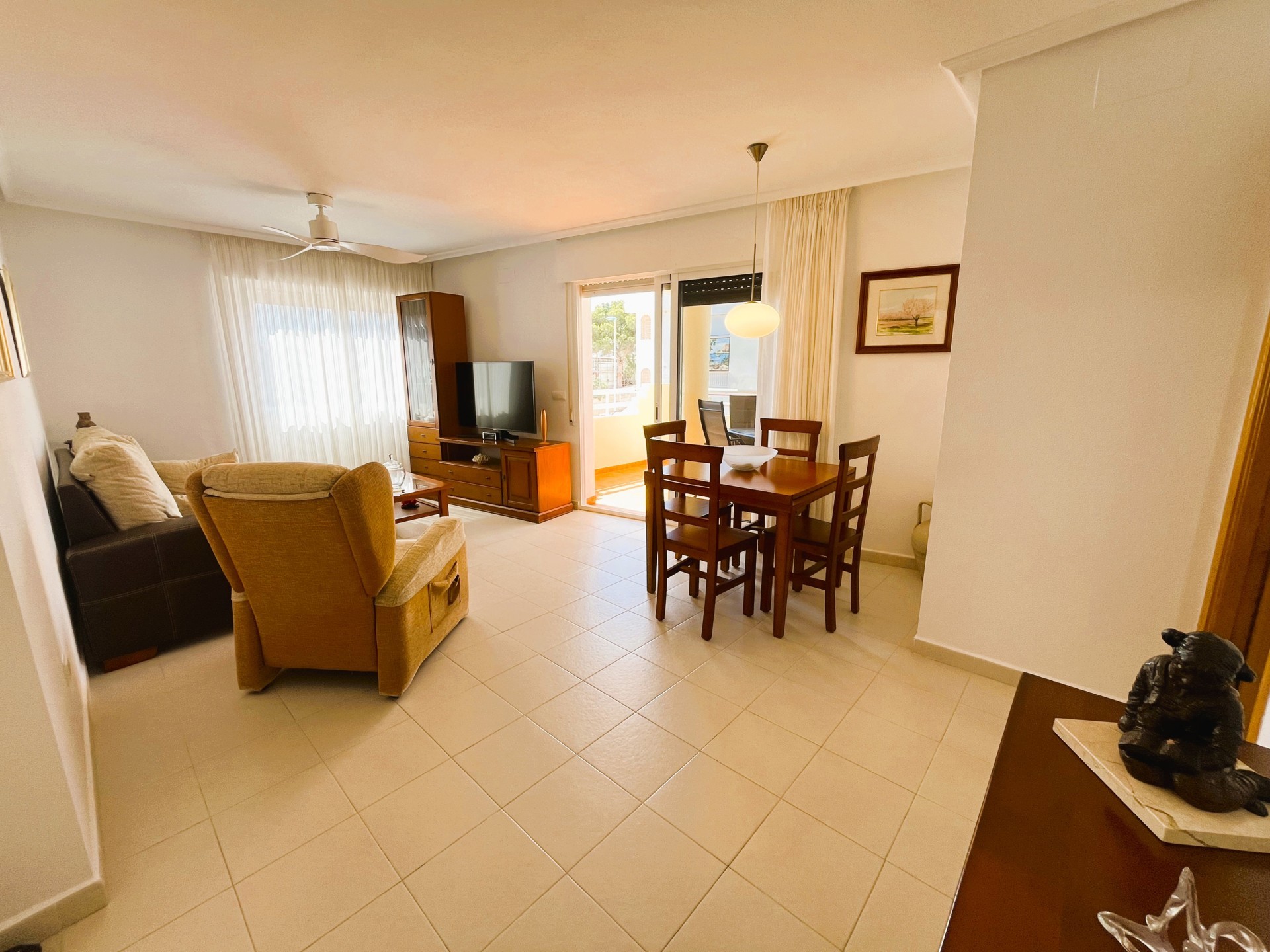Estupendo apartamento a solo 50 metros de la playa Disfruta de unas vacaciones inolvidables en este amplio y luminoso apartamento, ubicado a pocos metros del mar. La vivienda cuenta con un espacioso salón-comedor con ventilador de techo, muy luminoso y con acceso directo a una agradable terraza, ideal para relajarse. La cocina es independiente y está completamente equipada, incluyendo lavavajillas y zona de lavadero Dispone de tres dormitorios muy amplios, todos con armarios empotrados, y dos baños completos. El apartamento incluye plaza de garaje y acceso a una piscina comunitaria. Situado en una zona privilegiada, cerca de todos los servicios: supermercados, restaurantes, bares y algunas de las mejores playas de la zona. Estancia mínima de 11 noches. Este alojamiento se ofrece como estancia de media duración, conforme al Decreto Ley 9/2024 del Gobierno de la Comunidad Valenciana..