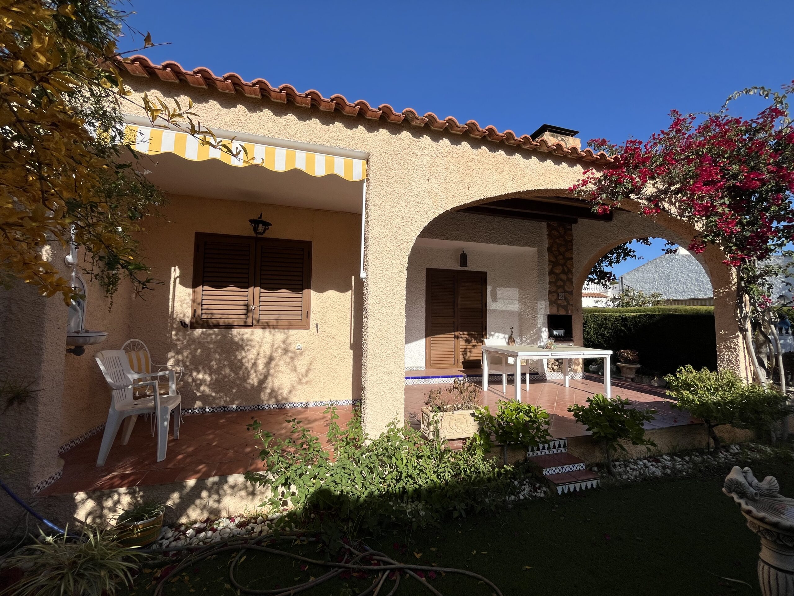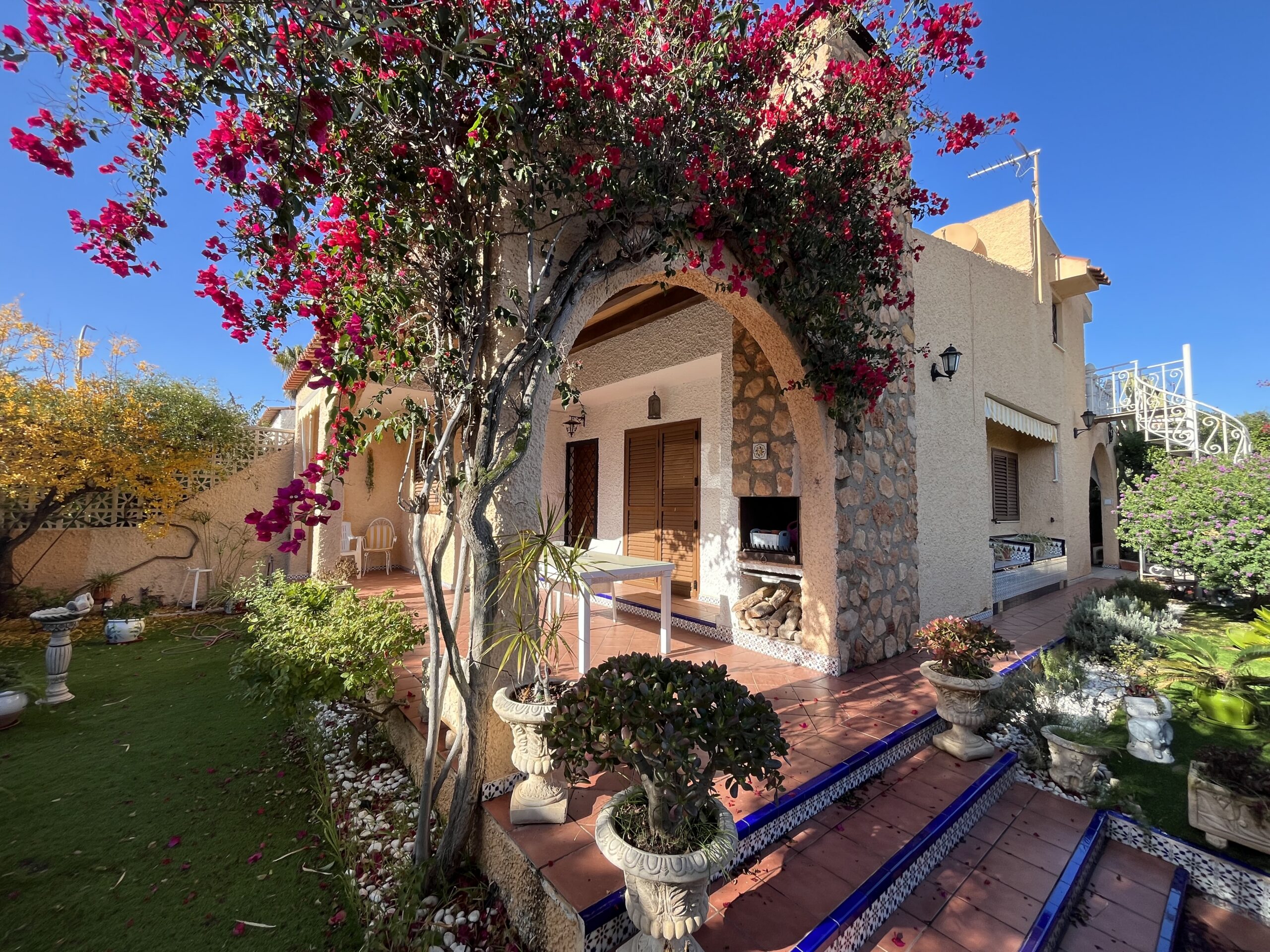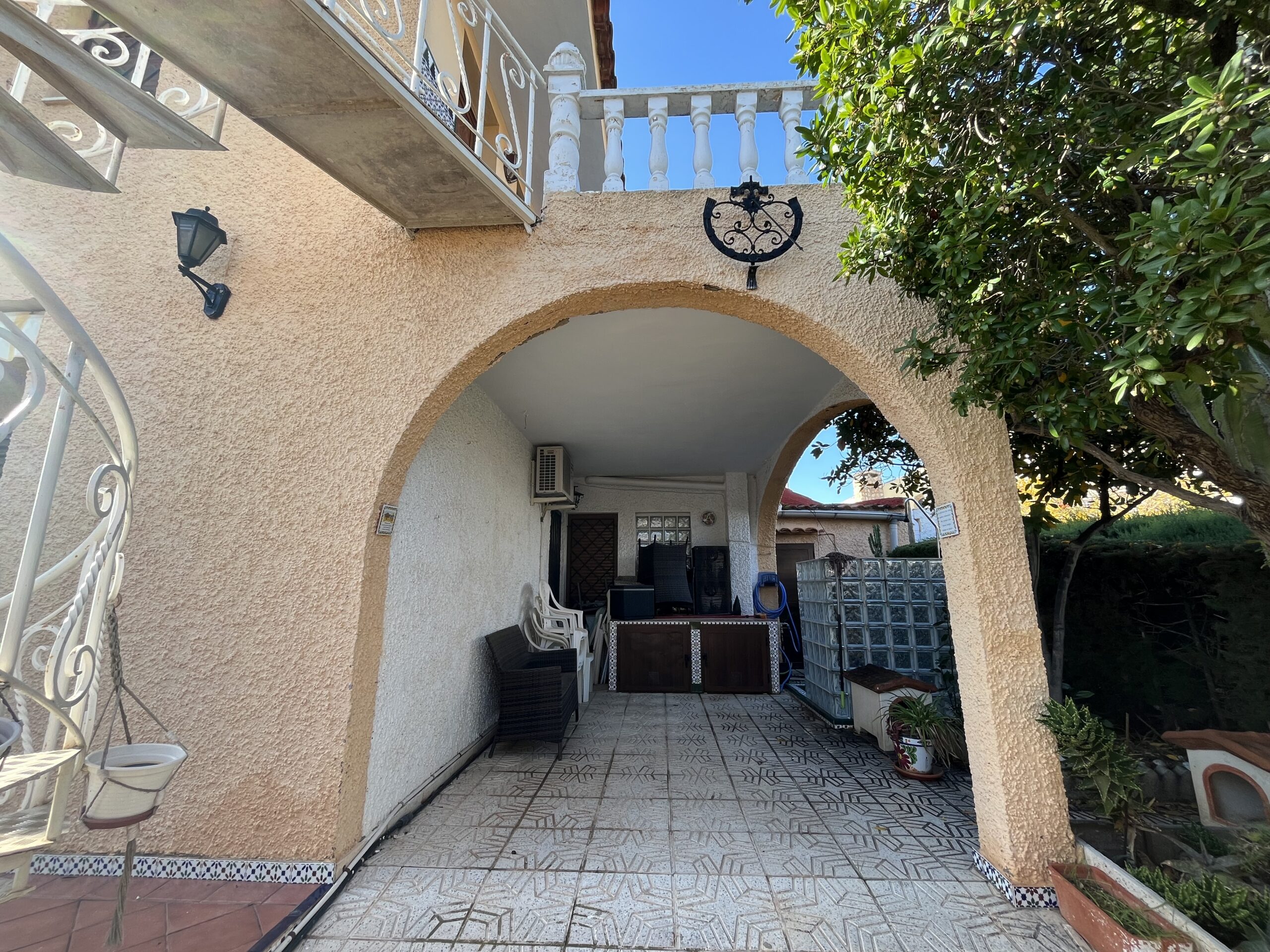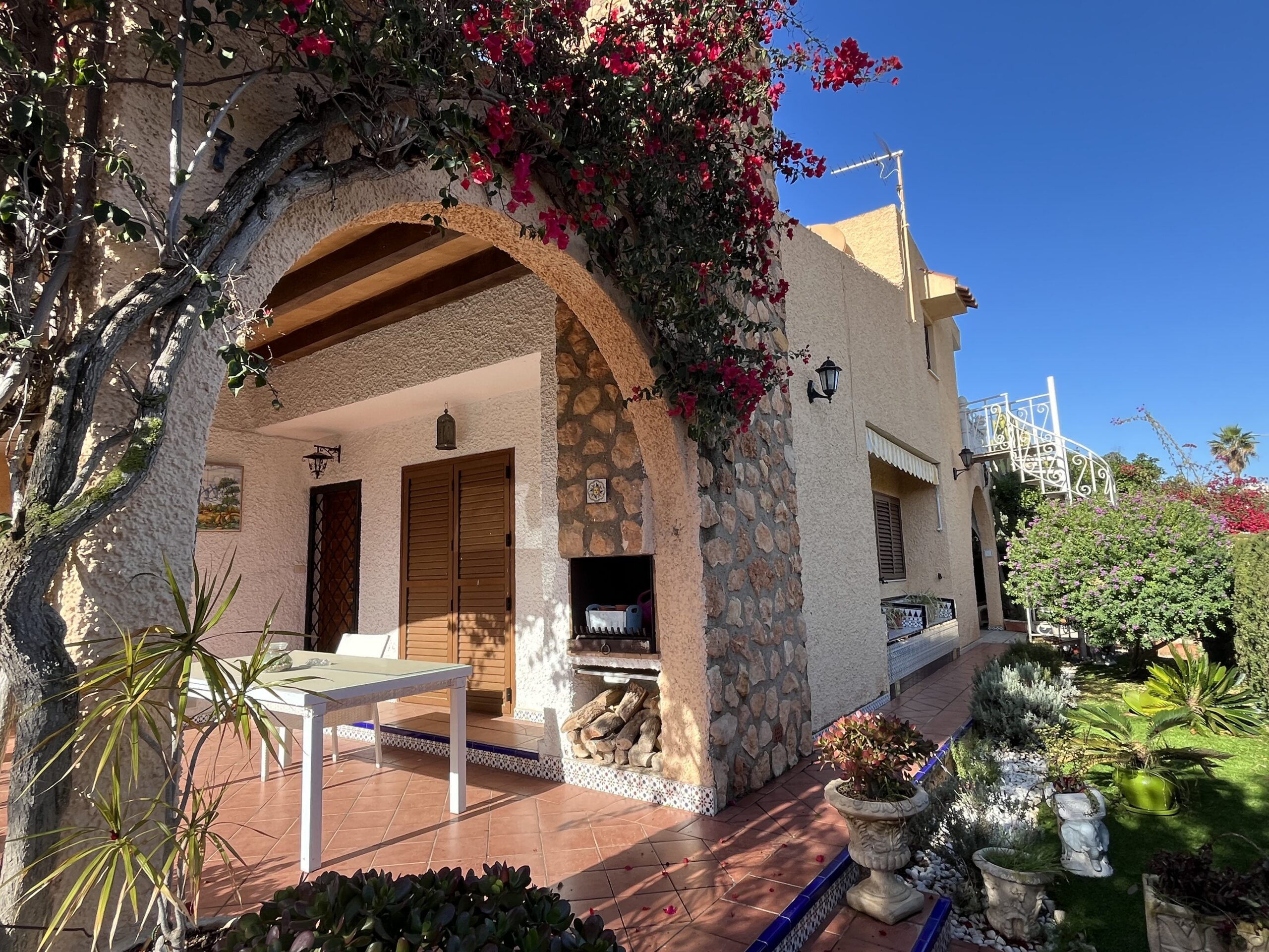 En la zona de las Villas II, encontramos este maravilloso adosado GEMINIS Tipo Duplex con muchas cualidades, entre ellas su gran orientación para el verano, puesto que es una casa que mira a Levante, osea este, lo que la convierte en una vivienda muy fresca para el verano. Nos gusta que han mantenido la vegetación en el exterior con bonitos arboles altos que dan sombra, muchas plantas y el cesped que rodea parcialmente la casa. Además, la casa la han ido reformando por lo que ya tiene mucho camino hecho. Desde sus exteriores, con toda la parte nuevamente enlosada, encontramos la terraza principal, que es la terraza frontal cubierta, y al otro ala encontramos la entrada al garaje zona la cual han habilitado tanto para meter el coche y dejarlo cubierto, como para hacer uso del mismo para comidas y reuniones varias, puesto que han habitalado y construido una zona como de barra,. más una zona de ducha exterior, y un trastero. Esta zona trasera tambien hay una puerta con acceso a la casa y una escalera que conecta con la parte superior a los 3 dormitorios de arriba. La zona superior está preprada con una gran terraza de entrada a cada una de las habitaciones. Bajamos a la zona principal de la casa, con una gran zona de salón conectada con el comedor, mucha luz y chimenea, al otro lado la nueva cocina completamente refomada con salida a una terraza acristalada- salita- comedor Por otro lado hablar de sus 2 dormitorios completos uno de ellos con baño en suit reformado y ventilado, un segundo dormitorio muy amplio con armario empotrado y su segundo baño..